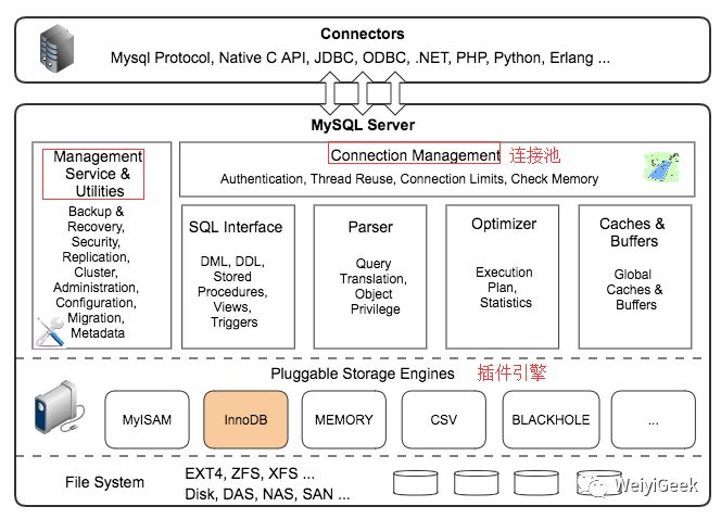 客户端连接语言,连接池组件,管理服务和工具组件,SQL接口组件,查询分析器组件,优化器组件,缓冲(Cache)组件,插件式存储引擎,物理文件;
