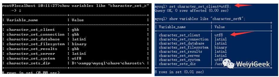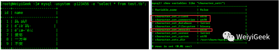 #set names latin1; 在里面查询得时候utf8的字符集将变码 | 当当前字符集为utf8时候latin1将乱码 (所以建议库表字符集一致)