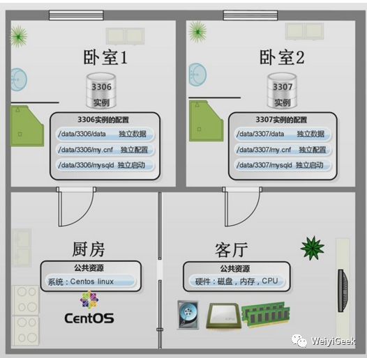 比如: MysQL 多实例相当于房子的多个卧室一样,每个实例可以看作一个卧室,整个服务器就是一套房子,服务器的硬件资源( cPu , meln . disk )可以看作房子的卫生间、厨房、厅一样,感房子的公用资源,北漂蜗居在一起,肯定要共用上述资源。