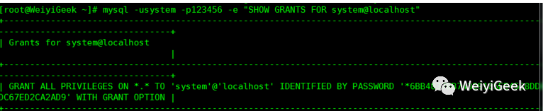 mysql -usystem -p123456 -e "SHOW GRANTS FOR system@localhost" # -e 交换式
