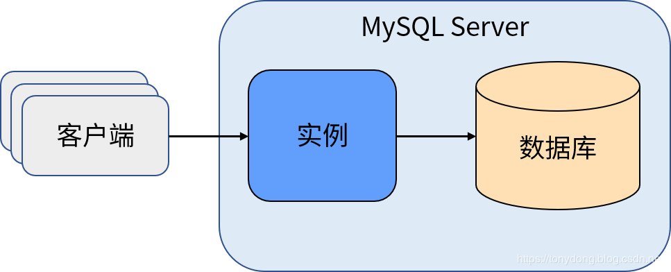 我们通常所说的 MySQL 数据库服务器由一个实例(instance)以及一个数据库(database)组成。实例包括一组后台进程/线程和许多内存结构,用于管理数据库;数据库由一组磁盘文件组成,用于存储数据和日志等信息。MySQL 使用典型的客户端/服务器(Client/Server)结构,下图显示了一个简单的 MySQL 体系结构: