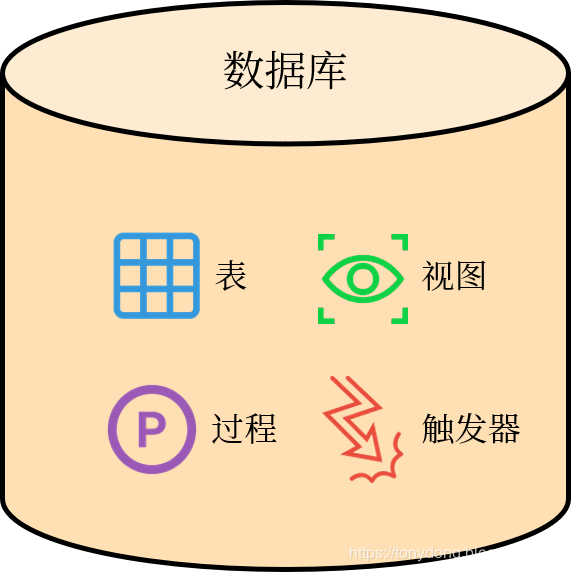 数据库就像是一个容器,存储了各种对象。例如,数据表(Table)、视图(View)、存储过程(Stored Procedure)以及触发器(Trigger)等。其中,表是存储数据的主要对象。它们之间的关系如下图所示: