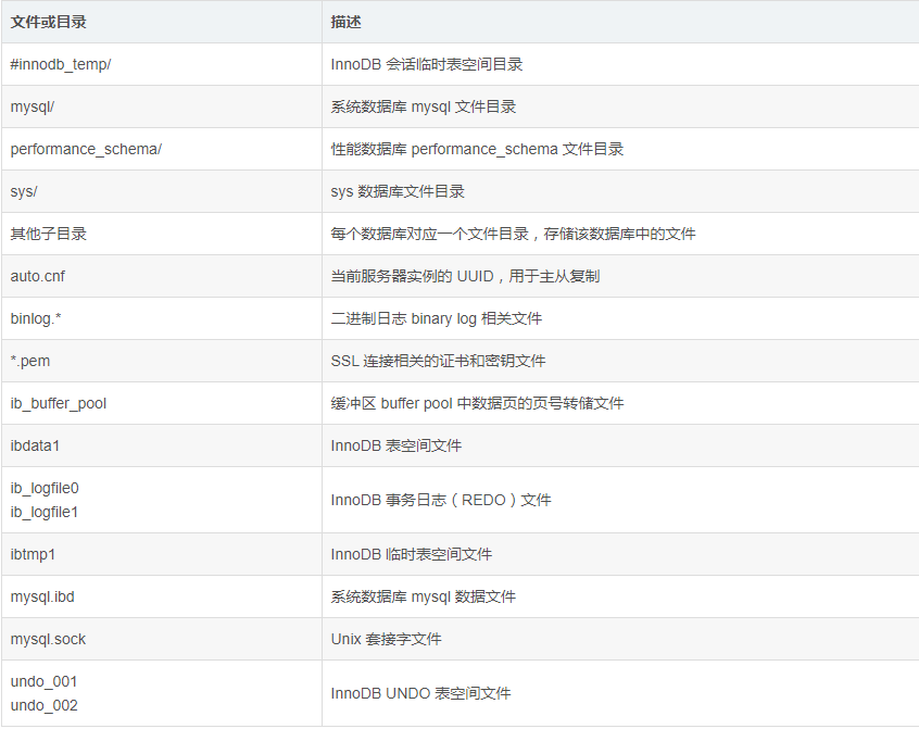 数据目录(Data Directory)是 MySQL 存储数据库文件的位置,Linux 上使用 RPM 包安装的默认位置为 var/lib/mysql/。数据目录中主要包含以下内容: