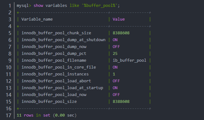 命令查看,例如以下命令可以查看 InnoDB 缓冲池相关的配置: