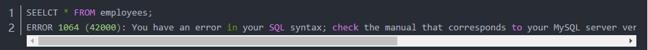 以上语句通过 SQL 查询接口提交给服务器的处理线程,解析器进行语法检查时发现 SELECT 写成了 SEELCT,提示的是语法错误。示例表来自《SQL 入门教程》示例数据库。
