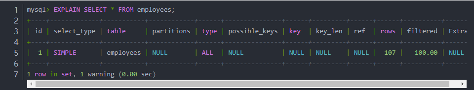 这里我们查询的是整个表的数据,因此 MySQL 采用全表扫描的方式(type = ALL)获取数据。
