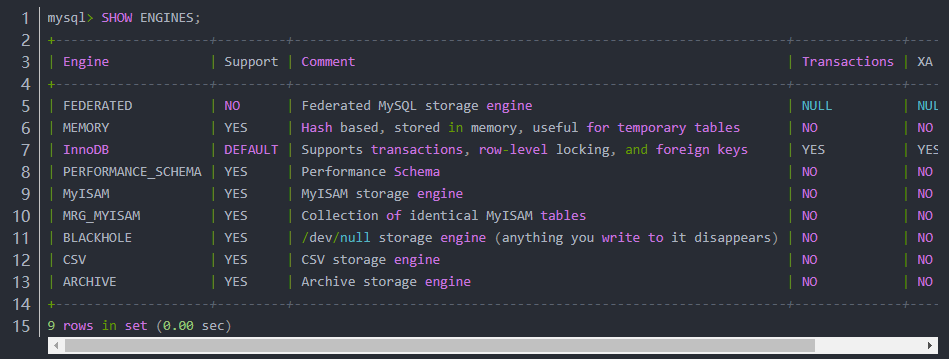 其中,Support 列显示了是否支持该存储引擎以及默认的存储引擎。MySQL 8.0 支持的存储引擎如下: