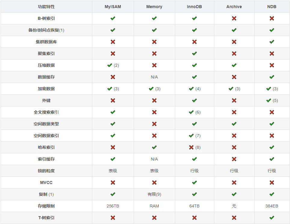 下表描述了 MySQL 中常见存储引擎支持的功能特性。