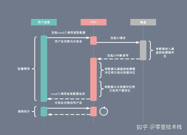 用户进程向 CPU 发起 read 系统调用读取数据,由用户态切换为内核态,然后一直阻塞等待数据的返回。