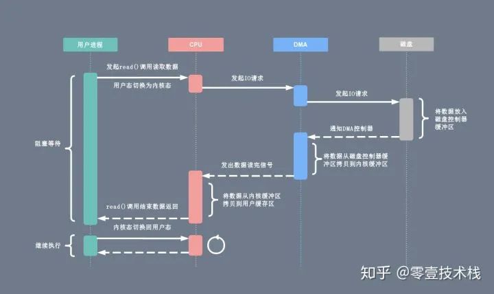 基于传统的 I/O 读取方式,read 系统调用会触发 2 次上下文切换,1 次 DMA 拷贝和 1 次 CPU 拷贝,发起数据读取的流程如下: