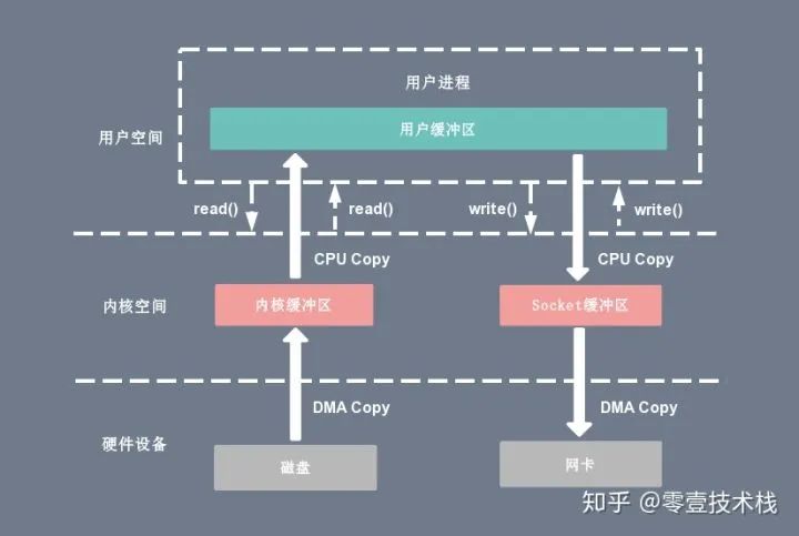 基于传统的 I/O 写入方式,write() 系统调用会触发 2 次上下文切换,1 次 CPU 拷贝和 1 次 DMA 拷贝,用户程序发送网络数据的流程如下: