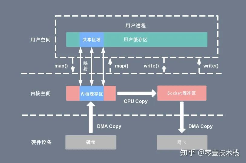 使用 mmap 的目的是将内核中读缓冲区(read buffer)的地址与用户空间的缓冲区(user buffer)进行映射,从而实现内核缓冲区与应用程序内存的共享,省去了将数据从内核读缓冲区(read buffer)拷贝到用户缓冲区(user buffer)的过程,然而内核读缓冲区(read buffer)仍需将数据拷贝到内核写缓冲区(socket buffer),大致的流程如下图所示: