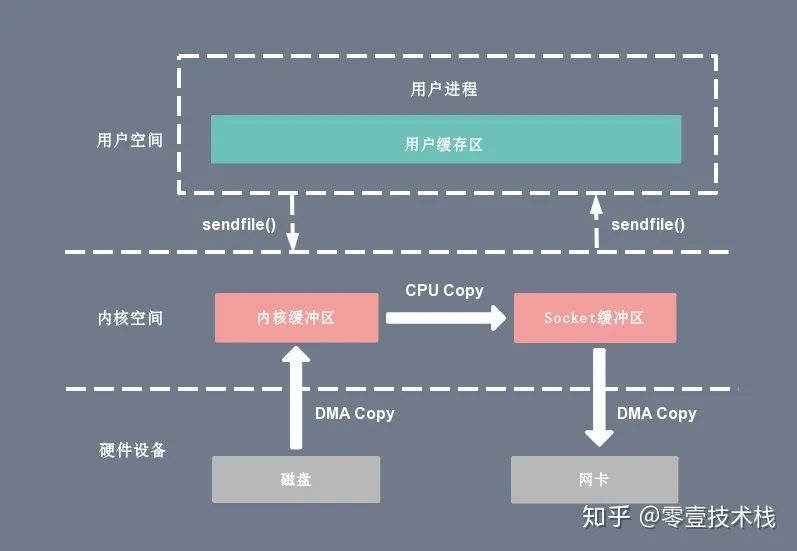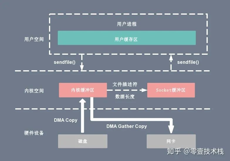Linux 2.4 版本的内核对 sendfile 系统调用进行修改,为 DMA 拷贝引入了 gather 操作。它将内核空间(kernel space)的读缓冲区(read buffer)中对应的数据描述信息(内存地址、地址偏移量)记录到相应的网络缓冲区( socket buffer)中,由 DMA 根据内存地址、地址偏移量将数据批量地从读缓冲区(read buffer)拷贝到网卡设备中,这样就省去了内核空间中仅剩的 1 次 CPU 拷贝操作,sendfile 的伪代码如下: