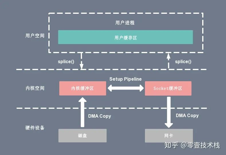 splice 系统调用可以在内核空间的读缓冲区(read buffer)和网络缓冲区(socket buffer)之间建立管道(pipeline),从而避免了两者之间的 CPU 拷贝操作。