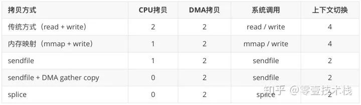 无论是传统 I/O 拷贝方式还是引入零拷贝的方式,2 次 DMA Copy 是都少不了的,因为两次 DMA 都是依赖硬件完成的。下面从 CPU 拷贝次数、DMA 拷贝次数以及系统调用几个方面总结一下上述几种 I/O 拷贝方式的差别。