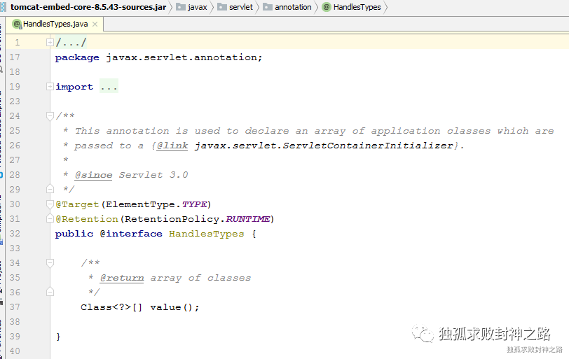 HandlesTypes 注解里面的接口下面的所有的实现类。然后再这个 onStartup 方法内部,将会循环的去调用这些实现类的方法,并将 servletContext 传递给这个实现类。可以猜到,HandlesTypes 注解必定也是 Servlet 所提供的。