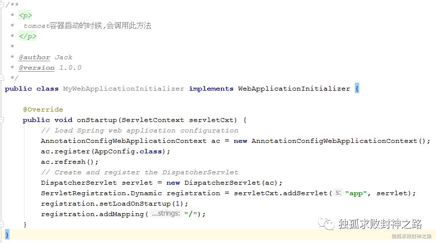 如果你细心一点的话,将会发现,在这个实现类里面,并没有去做 Servlet 的定义与注册?那这一步在哪里去实现的呢?你可能发现了,在 SpringServletContainerInitializer 实现类上面有 HandlesTypes 注解。其实当程序启动的时候,SpringServletContainerInitializer 的 onStartup 方法会被调用,这个方法的入参将会带入 servletContext 以及