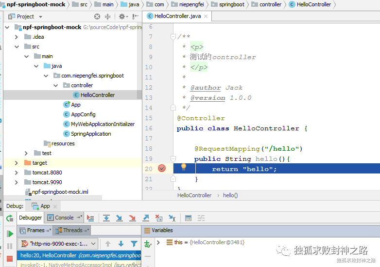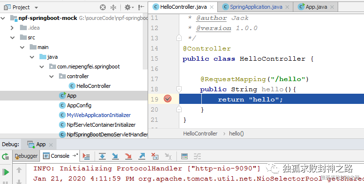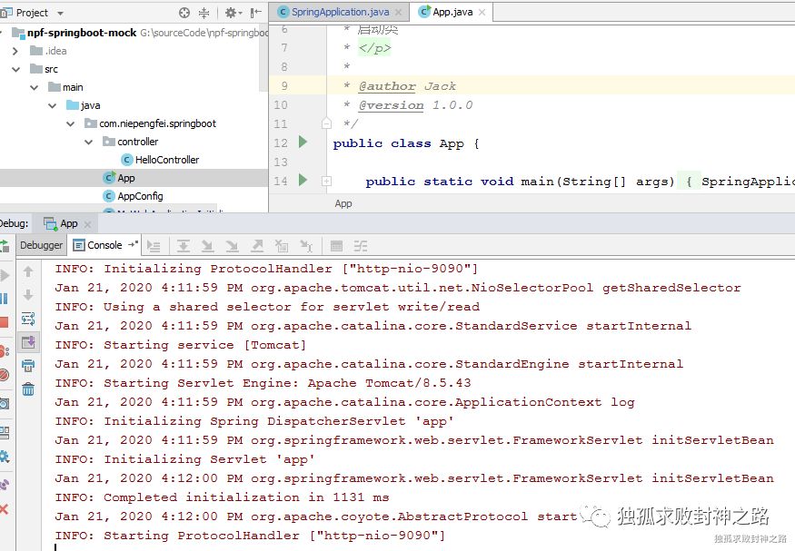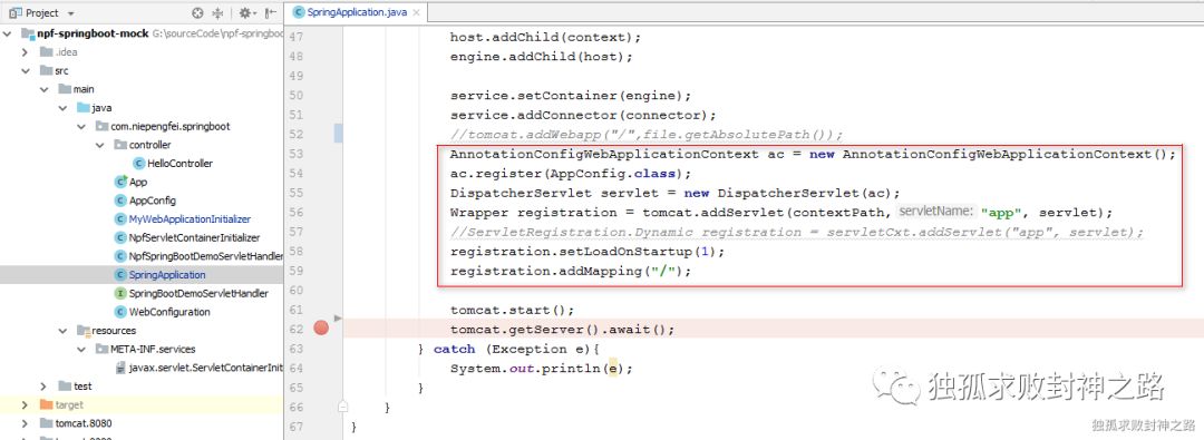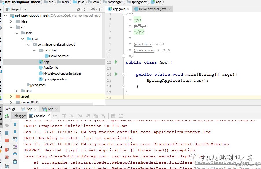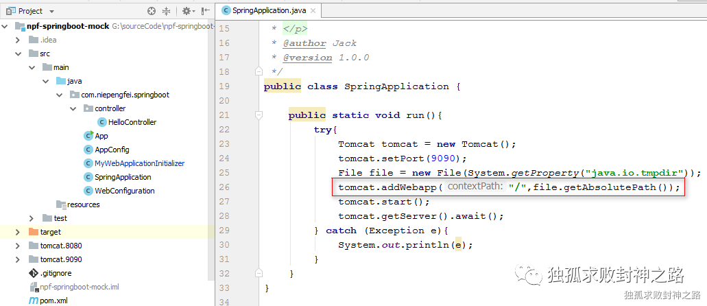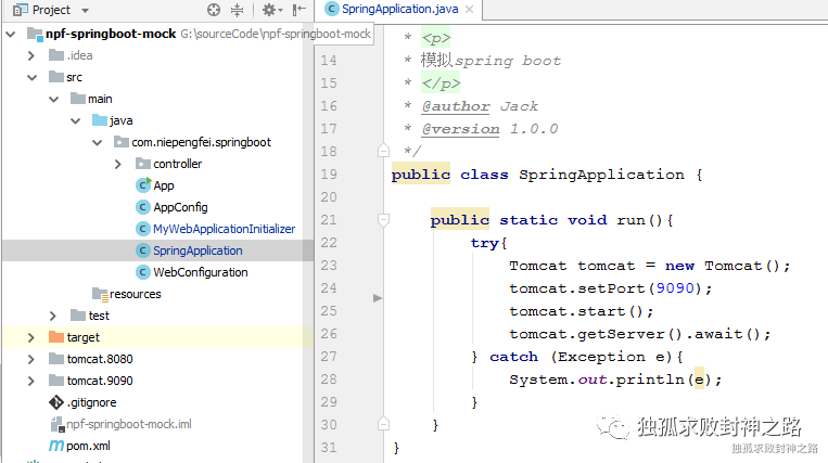 其次,我们模仿 spring boot 的做法,也搞一个自己的 SpringApplication,然后在里面启动一个 tomcat 实例。