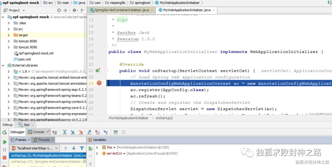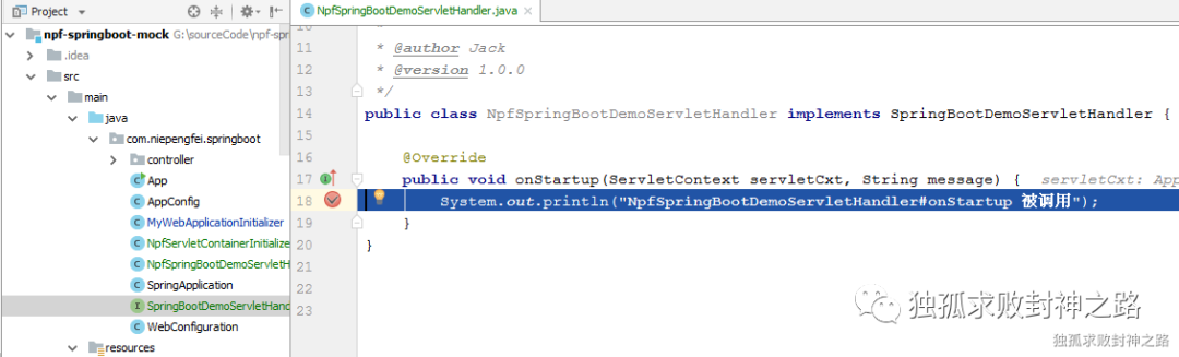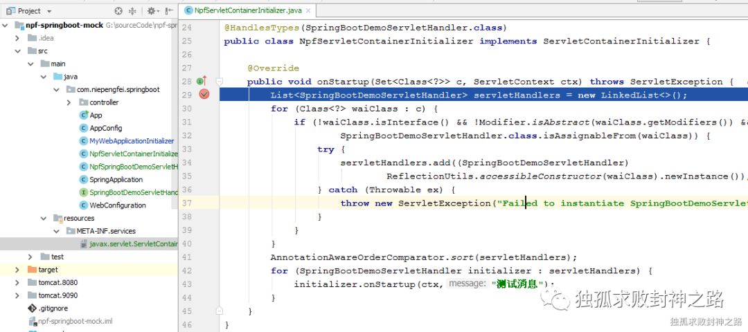 其次是 NpfSpringBootDemoServletHandler 的 onStartup 方法被调用。