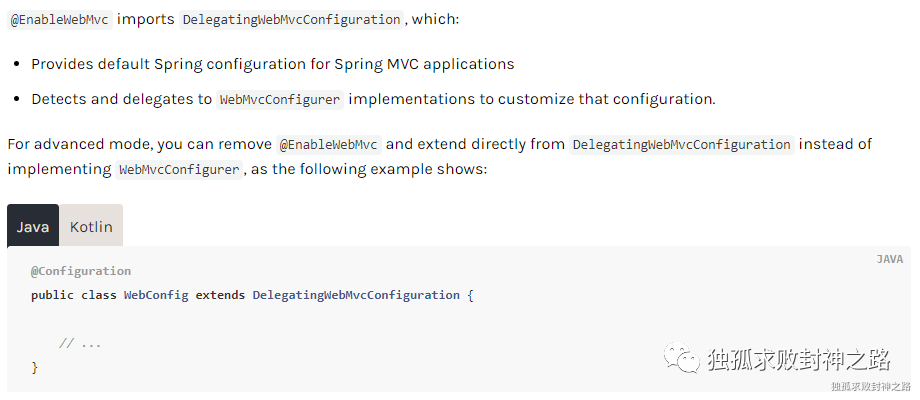 那么为什么我们实现了 WebMvcConfigurer , 里面的方法就会被调用呢?其实这里是一个回调。如果你不加 @EnableWebMvc 这个注解的话,这个方法是不会被回调的。官方网站上说的很清楚。官方网站如下 :