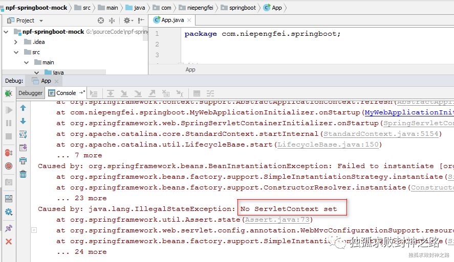 然后运行我们的程序,发现并不是刚才我们分析的那样。SpringServletContainerInitializer 并没有如期执行。那么问题究竟出在什么地方呢?请注意一点的是,我们刚才分析的那么多,一切都是基于当前项目是一个 web 项目的前提下才成立。尽管当前我们的项目看上去不像是一个 web 项目,但是当 tomcat 执行了如下代码: