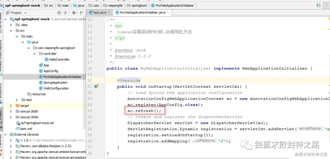 首先参考 spring mvc 官方的做法,启动一个 spring 容器,然后直接 new 出来一个 servlet 实例。