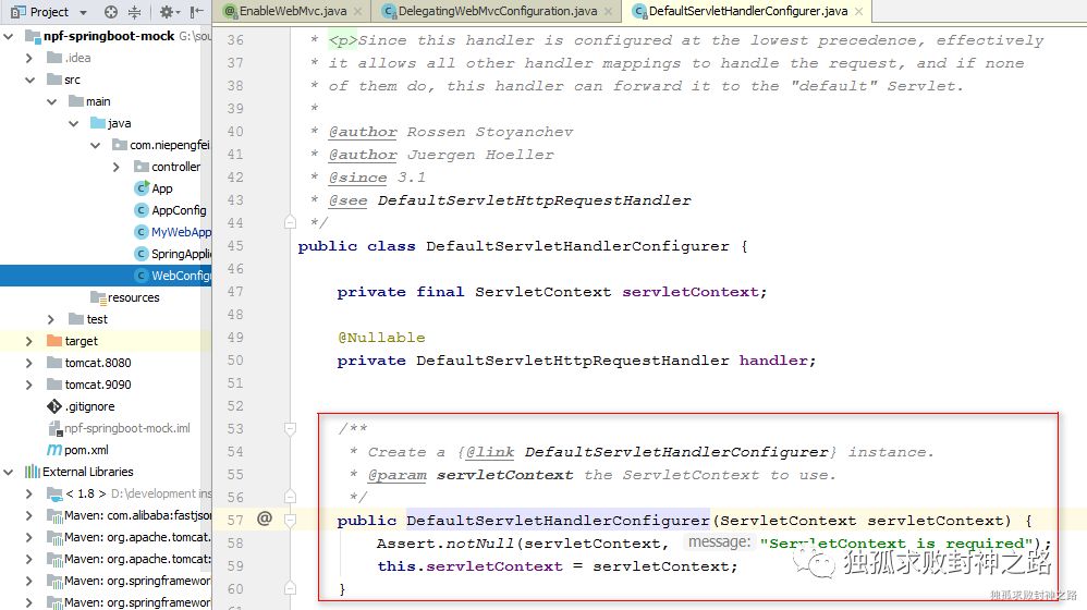 当 tomcat 启动的时候,执行到这行代码,这行代码就会去初始化 spring 容器,当它初始 spring容器的时候,WebConfiguration 中刚才我们使用的 @EnableWebMvc 这个注解的实现需要使用到 Servlet Context 上下文,但是此时我们的 Servlet 根本还没有实例化,故此时根本就不会有 Servlet Context 上下文,所以 spring 容器的初始化过程必定会失败。我带你去看一下 @EnableWebMvc 底层确实需要依赖 ServletContext 这个对象。