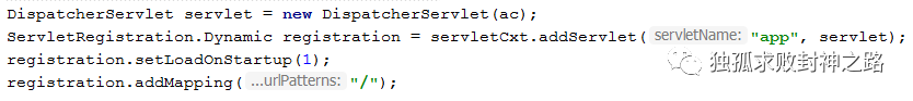 你注意看,有一行代码执行 setLoadOnStartup(1) , 意思是当 servlet 被实例化的时候,同时也要去执行这个 servlet 的 init 方法。