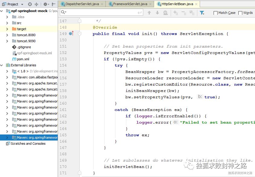 而在这个 init 方法里面,会去调用 initServletBean 方法。