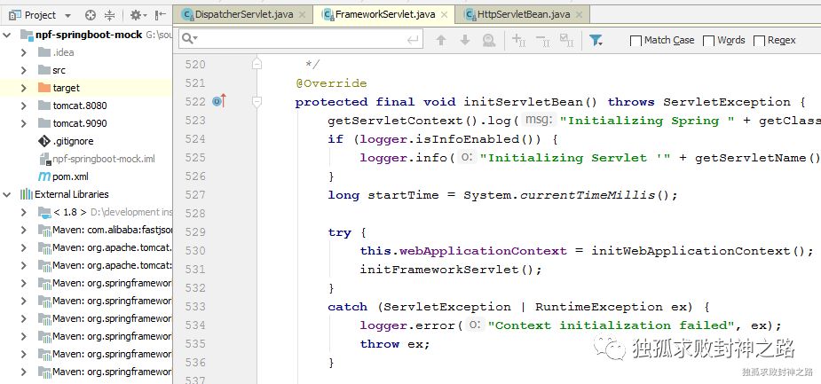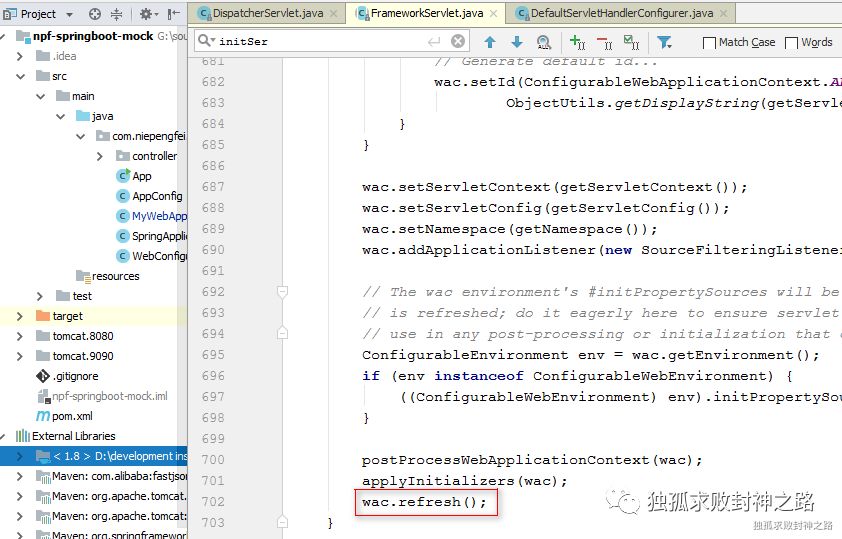 这就是网上说的父容器和子容器等话题,也不是一两句就能说清楚的,之后我再撰文详细的说明。在这里,你只要知道,init 方法内部会去初始化 spring 容器。