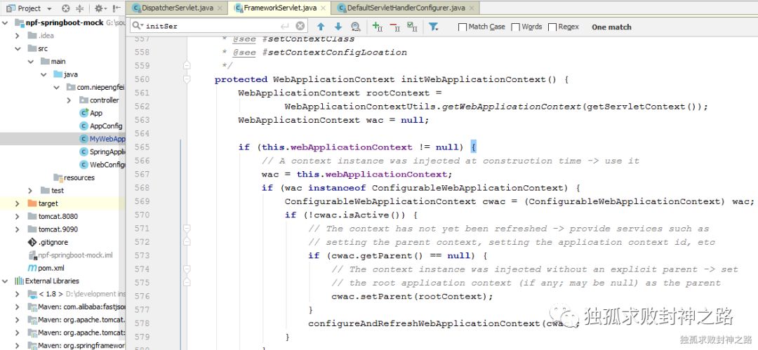 而在 initServletBean 方法内部,调用了 initWebApplicationContext 方法。之后在这里方法内部,将会去调用