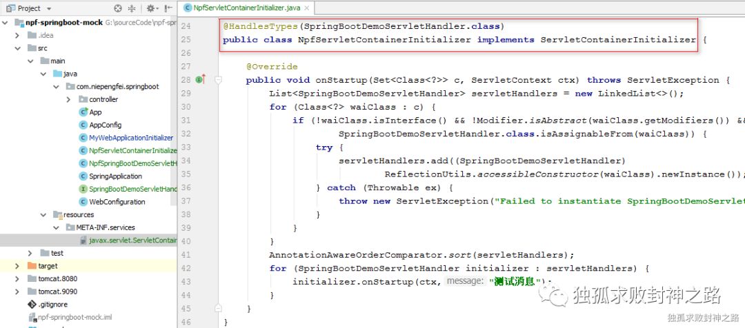 2. NpfServletContainerInitializer 类上面有 @HandlesTypes 注解,注解里面是一个接口。