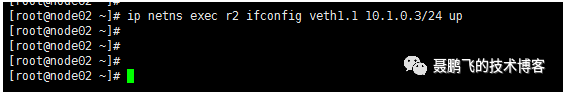事实上,你也可以将veth1.1这个网卡设备,移动到 r2 这个网络名称空间中,这样的话,r1 和 r2 这两个网络名称空间就可以直接通信了。我们试一下。