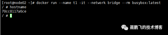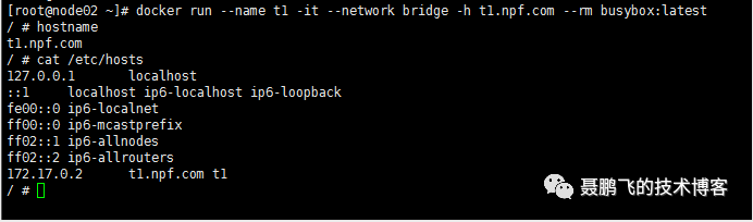 docker run --name t1 -it --network bridge -h t1.npf.com --rm busybox:latest