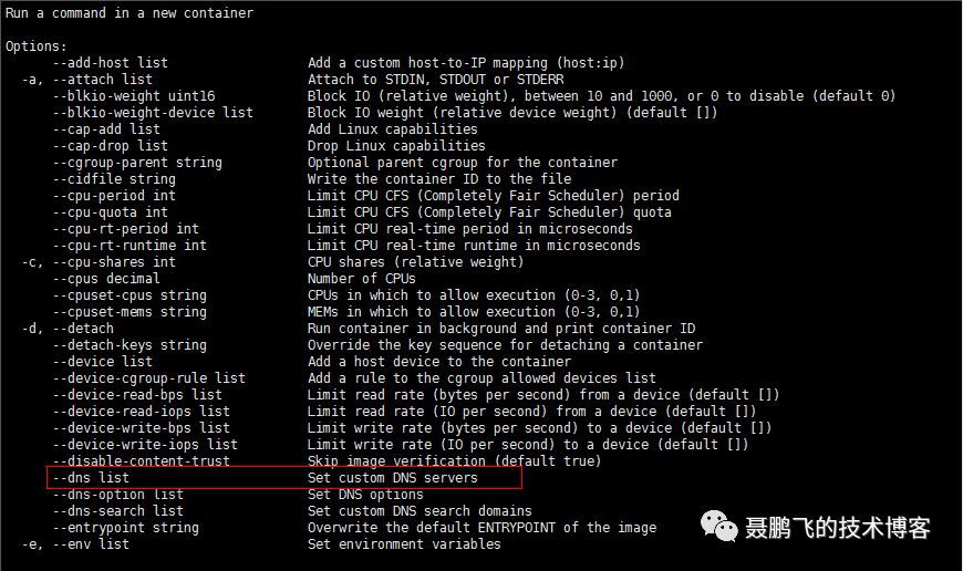 接下来,我们手动的去给容器设置 DNS 服务器,我们可以使用 docker run --help 命令,去寻求帮助。