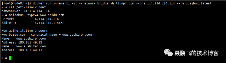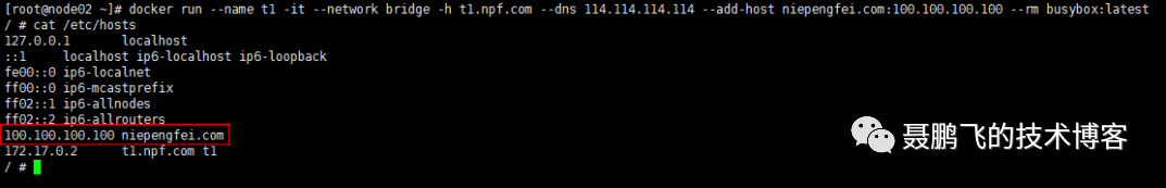 docker run --name t1 -it --network bridge -h t1.npf.com --dns 114.114.114.114 --add-host niepengfei.com 100.100.100.100 --rm busybox:latest