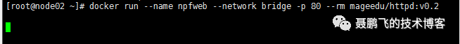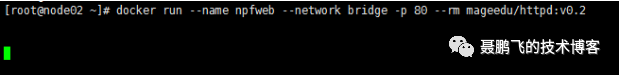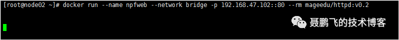 docker run --name npfweb --network bridge -p 192.168.47.102::80 --rm mageedu/httpd:v0.2