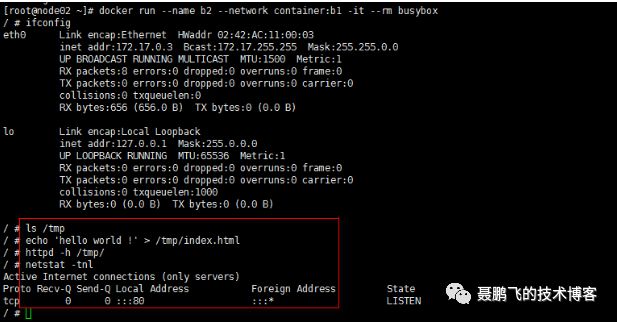 在 b1 这个容器上面,可以通过 127.0.0.1 进行访问,可想而知,b1 和 b2 确实是共享同一个网络名称空间,就相当于他们两个是运行在同一个主机上面的两个进程一样。但是实际上,他们还是有隔离的。