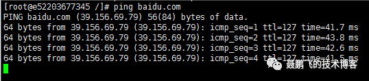 从上面可以看到,默认的DNS服务器指向的是当前宿主机的dns服务器。因为我们的宿主机可以连外部的网络,那么按照道理来说,当前的容器是可以解析外部的主机名的,例如:www.baidu.com 我们可以来尝试一下: