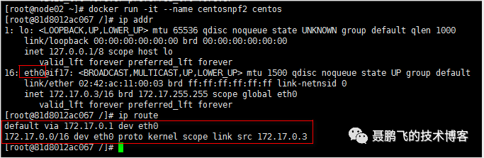在 centosnpf1 容器内可以看到两块网卡:lo 和 eth0。其中 lo 是容器的回环网卡,eth0 是容器与外界通信的网卡,eth0 的 IP 信息为 172.17.0.2/16,和宿主机上的网卡 docker0 在同一网段中。查看 centosnpf1 的路由信息: