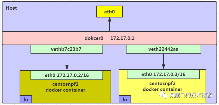 发现多了一个以 "veth" 开头的网卡,这是一个 veth 设备。而 veth 设备总是成对出现的(veth pair是用于不同network namespace间进行通信的方式,veth pair 将一个 network namespace 数据发往另一个 network namespace 的 veth),那么与 vethb7c23b7 配对的就应该是 centosnpf1 容器中的 eth0 了。既然 centosnpf1 容器中的 eth0 是与 docker0 连通的,那么 vethb7c23b7 也应该是与 docker0 连通的。因此 docker0 并不是一个简单的网卡设备,而是一个网桥。