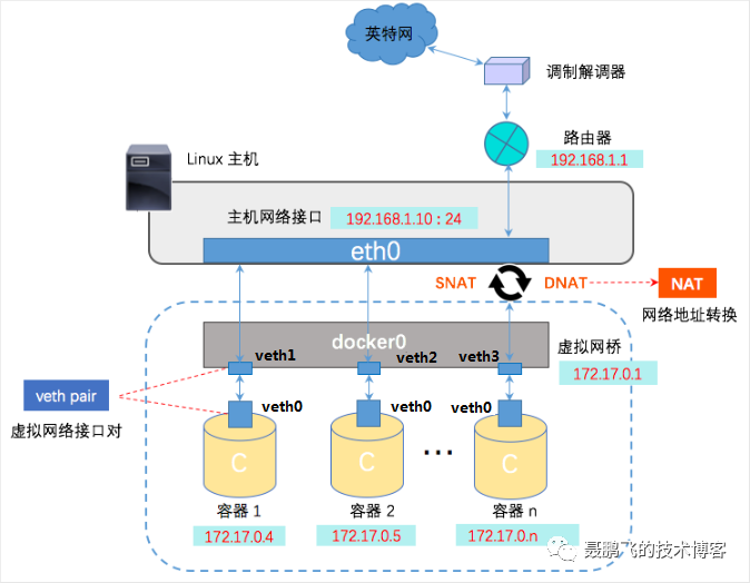 容器与外界通信 : 容器如果需要联网,则需要采用 NAT [网络地址转换(Network Address Translation)的缩写,是一种在 ip 数据包通过路由器或防火墙时重写来源 ip 地址或目的 ip 地址的技术] 方式。NAT 包含两种转换方式:SNAT 和 DNAT 。