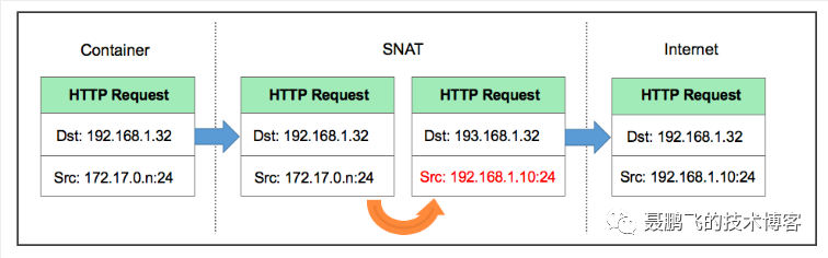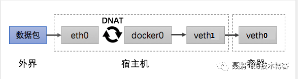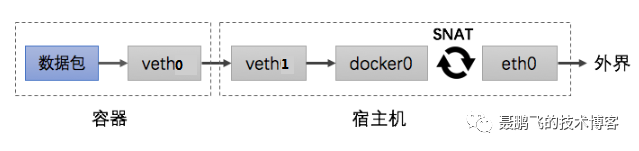 当容器需要访问宿主机以外的世界时,数据包的流向为下图所示: