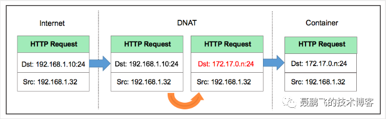 当宿主机以外的世界需要访问容器时,数据包的流向如下图所示: