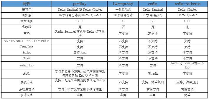注1:对于Redis服务代理层的实现,业内常用的代理软件对比如下,其中性能方面无论是单线程还是多线程调用Redis代理,Predixy的性能都是最好的,甚至与直连Redis服务相差无几: