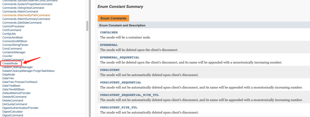 首先我们来了解一下zookeeper的节点类型CreateMode,以3.6.2为例,这个是zookeeper的官方文档https://zookeeper.apache.org/doc/r3.6.2/apidocs/zookeeper-server/index.html
