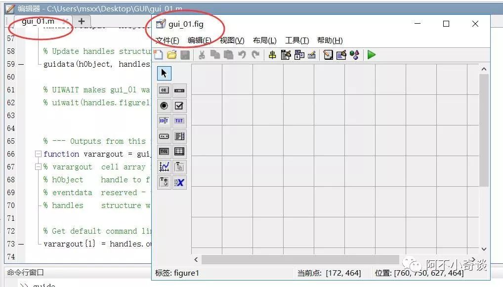 3.点击确定,会弹出新建好的GUI编辑界面以及GUI相对应的M文件;