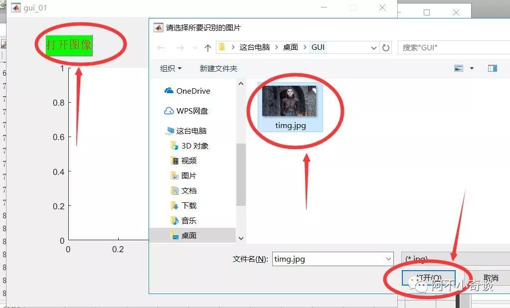 10.在GUI编辑界面gui_01.fig中,点击运行,即可执行新建的GUI界面。点击“打开图像”,便会弹出选择窗口,对待打开的图像进行选择,点击打开;