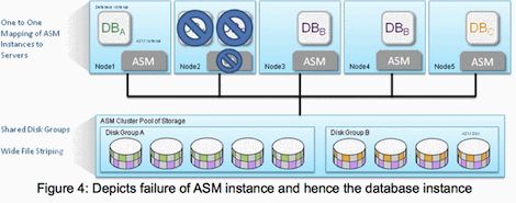 注:在这里,数据库实例与特定节点中运行的特定 ASM 实例关联。如果因为某种原因,ASM 实例无法启动/服务关闭,数据库实例仍然可以启动,因为数据库实例将查找同一集群中运行的 ASM 实例。图 3 描绘了 Flex ASM 的高可用特性。