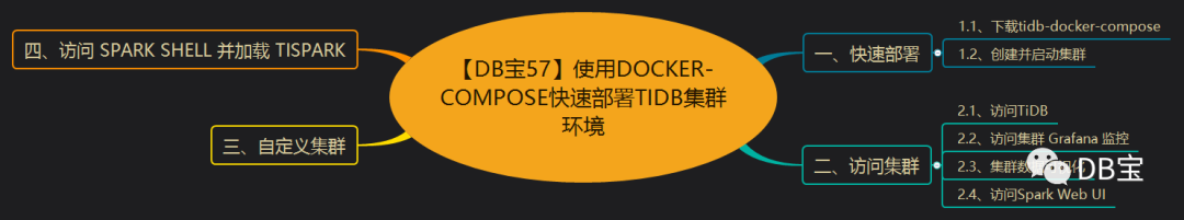 一、快速部署1.1、下载tidb-docker-compose1.2、创建并启动集群二、访问集群2.1、访问TiDB2.2、访问集群 Grafana 监控2.3、集群数据可视化2.4、访问Spark Web UI三、自定义集群四、访问 Spark shell 并加载 TiSpark